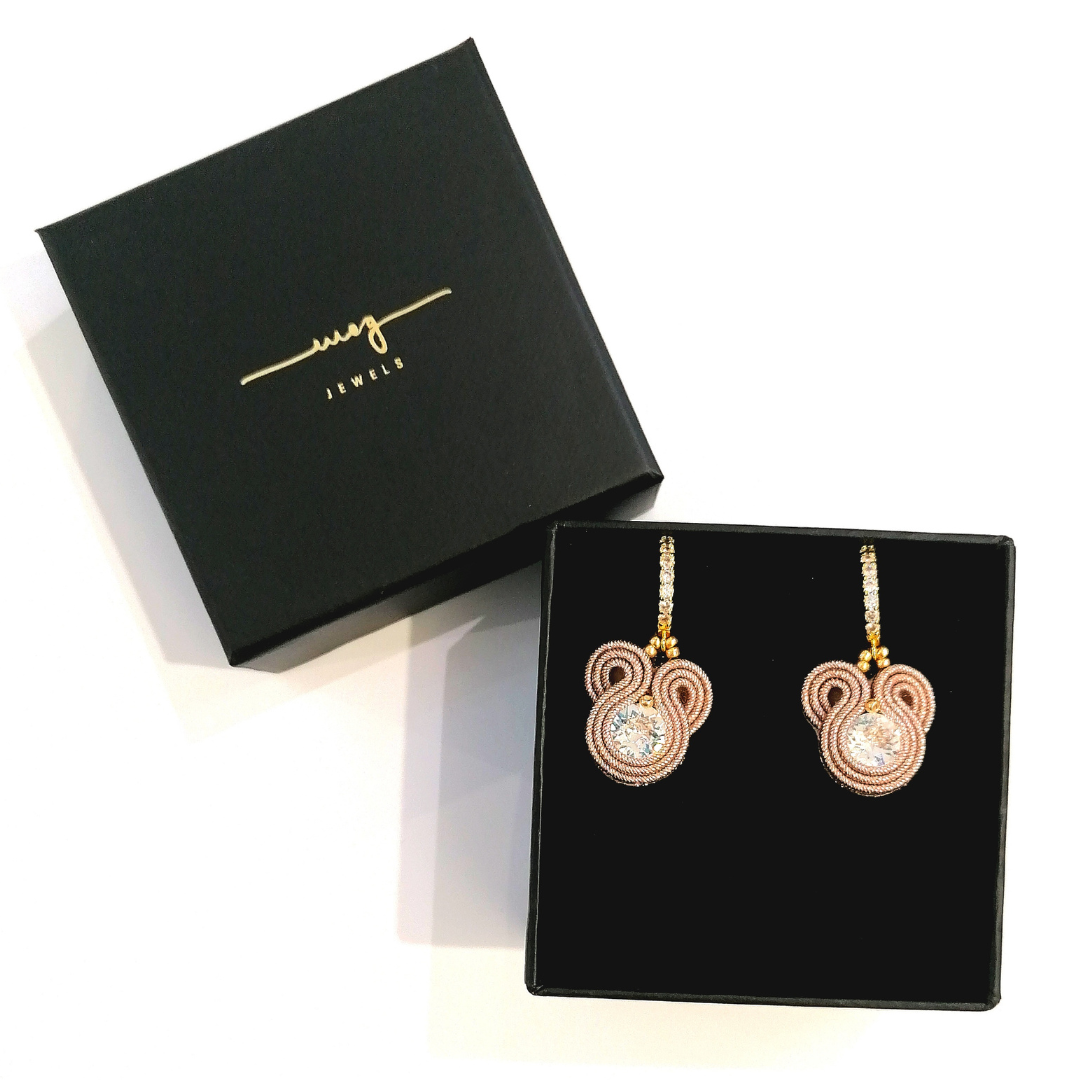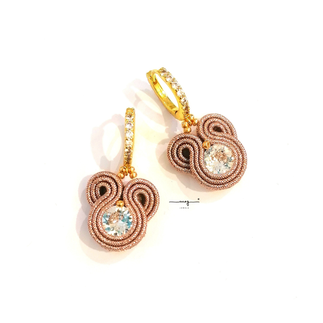 Entirely hand-sewn, BabyM hoops by MEG Jewels® are made of italian yarns, premium crystals, nickel free hoops, Alcantara. Pink earrings with gold hoops.