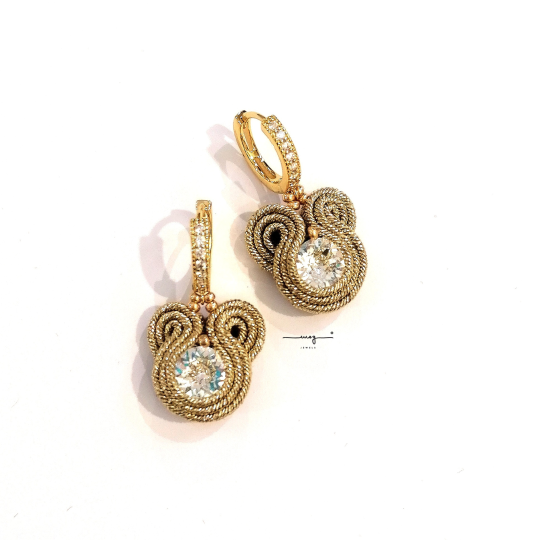 Entirely hand-sewn, BabyM hoops by MEG Jewels® are made of italian yarns, premium crystals, nickel free hoops, Alcantara. Gold earrings with gold hoops.