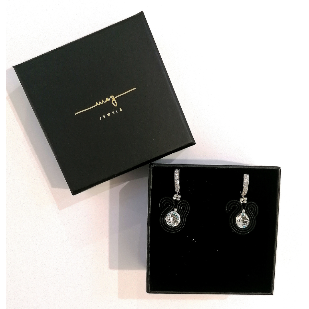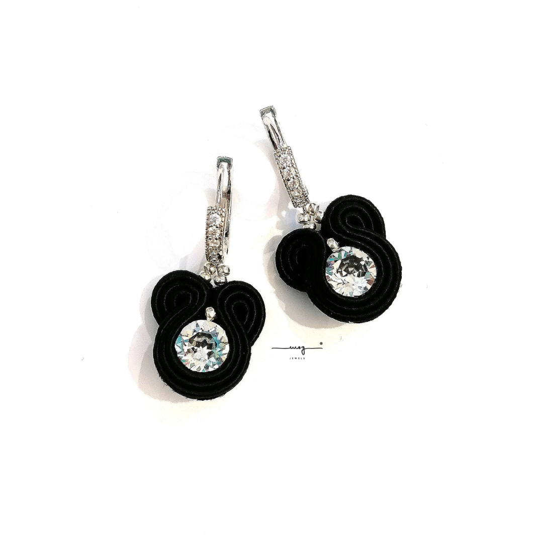 Entirely hand-sewn, BabyM hoops by MEG Jewels® are made of italian yarns, premium crystals, nickel free hoops, Alcantara. Black earrings with silver hoops.