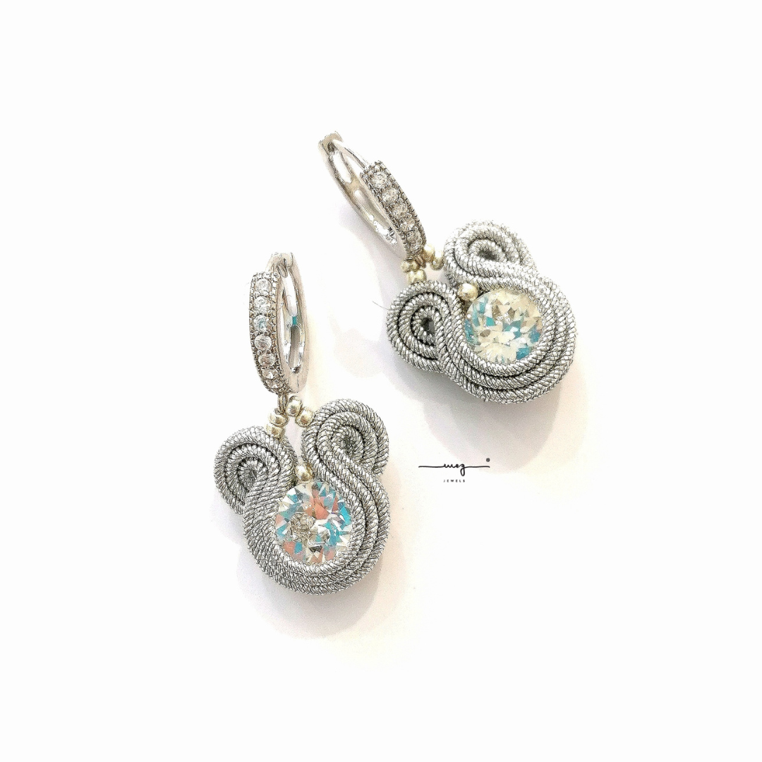 Entirely hand-sewn, BabyM hoops by MEG Jewels® are made of italian yarns, premium crystals, nickel free hoops, Alcantara. Silver earrings with silver hoops.