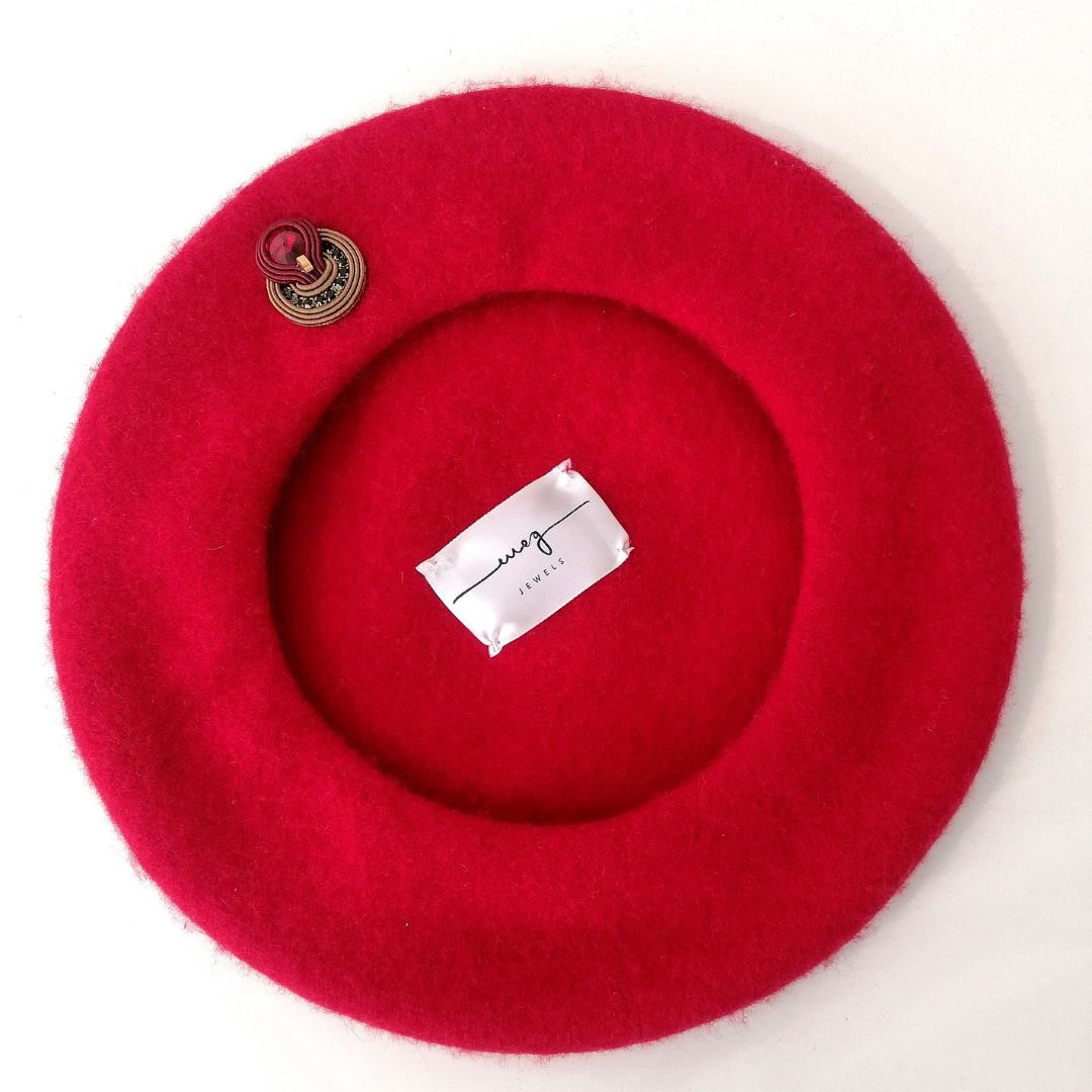 Basco in vera lana (90%), taglia unica. Gioiello interamente cucito a mano con intrecci di filati italiani e cristalli premium. Colore rosso gioiello rosso, nero, cammello.