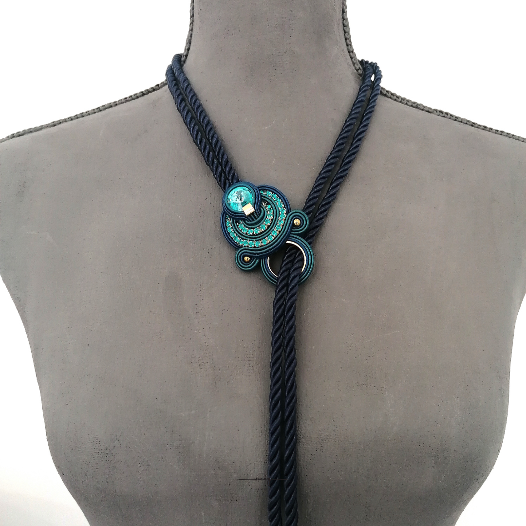Entirely handsewn with italian yarns, premium crystals, Alcantara. Colors: blue, petroleum, gold. Size 110 cm.