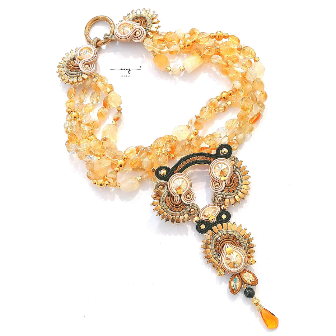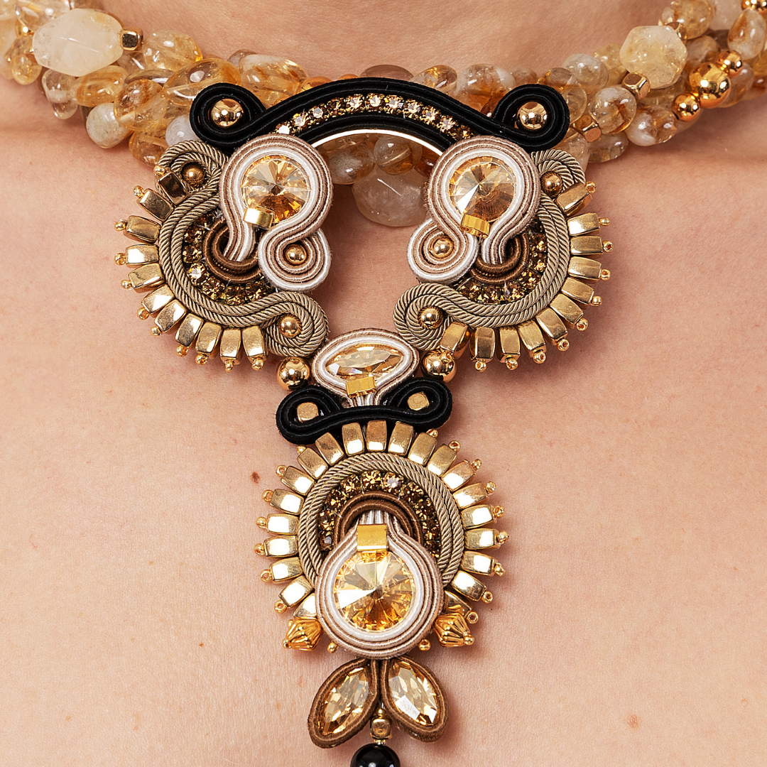 Necklace, GENESIS Collection by MEG Jewels®. Entirely hand-sewn, made of Italian yarns, premium crystals, citrine quartz, nickel free details, Alcantara. Certificate of guarantee and authenticity.