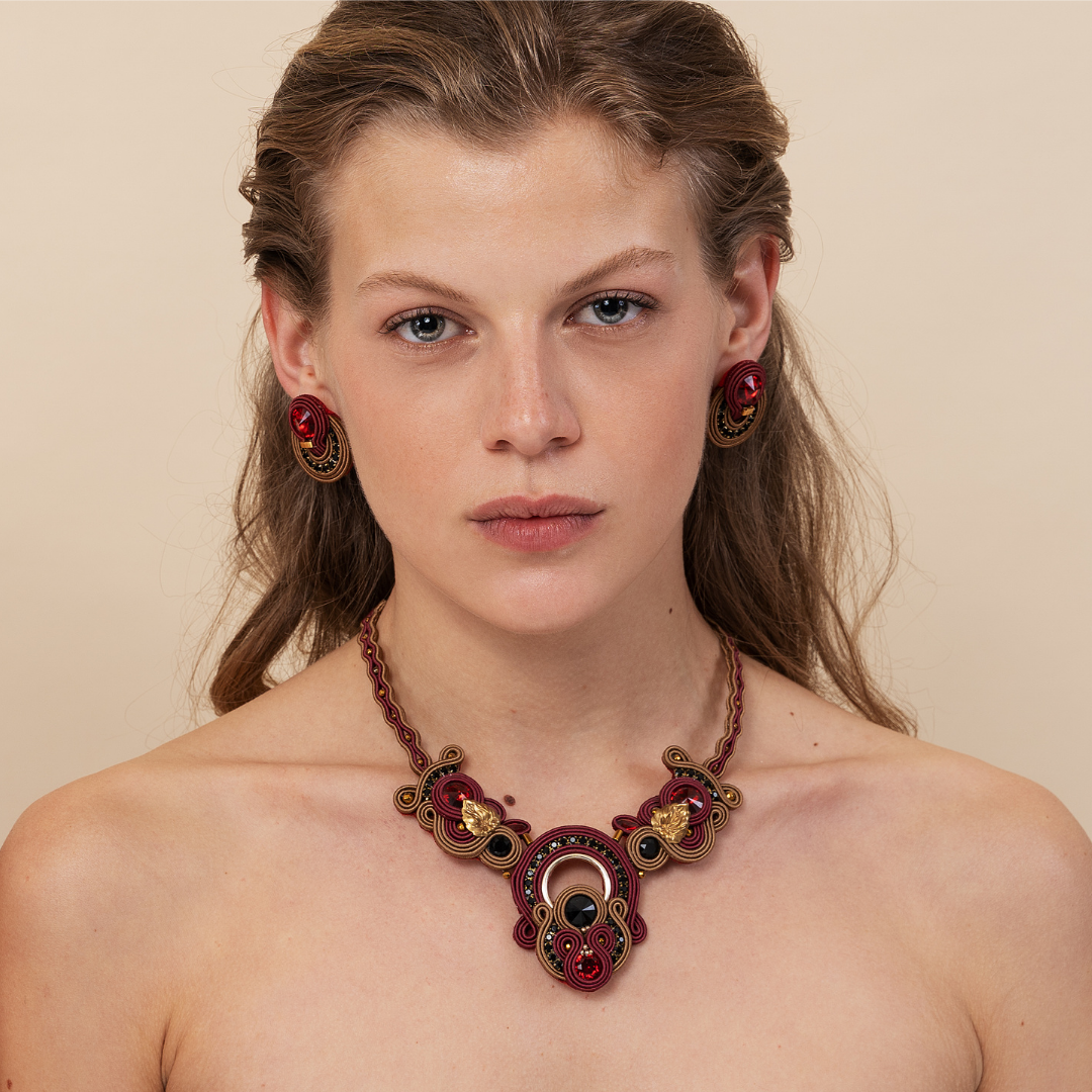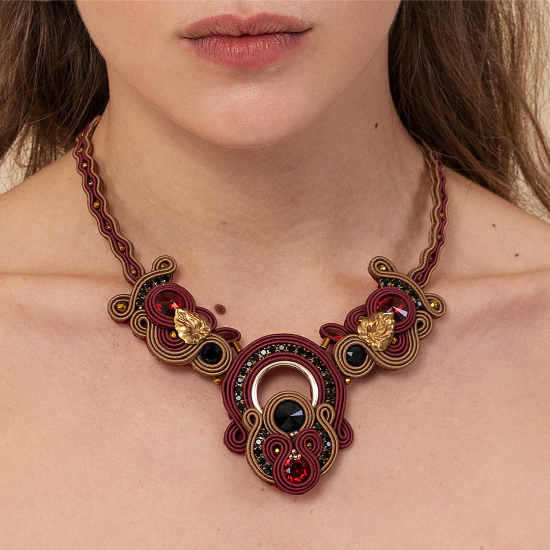 Necklace from 'Oriente' Collection by MEG Jewels ®. Entirely hand-sewn, made of Italian yarns, premium crystals, Alcantara. Certificate of guarantee and authenticity.