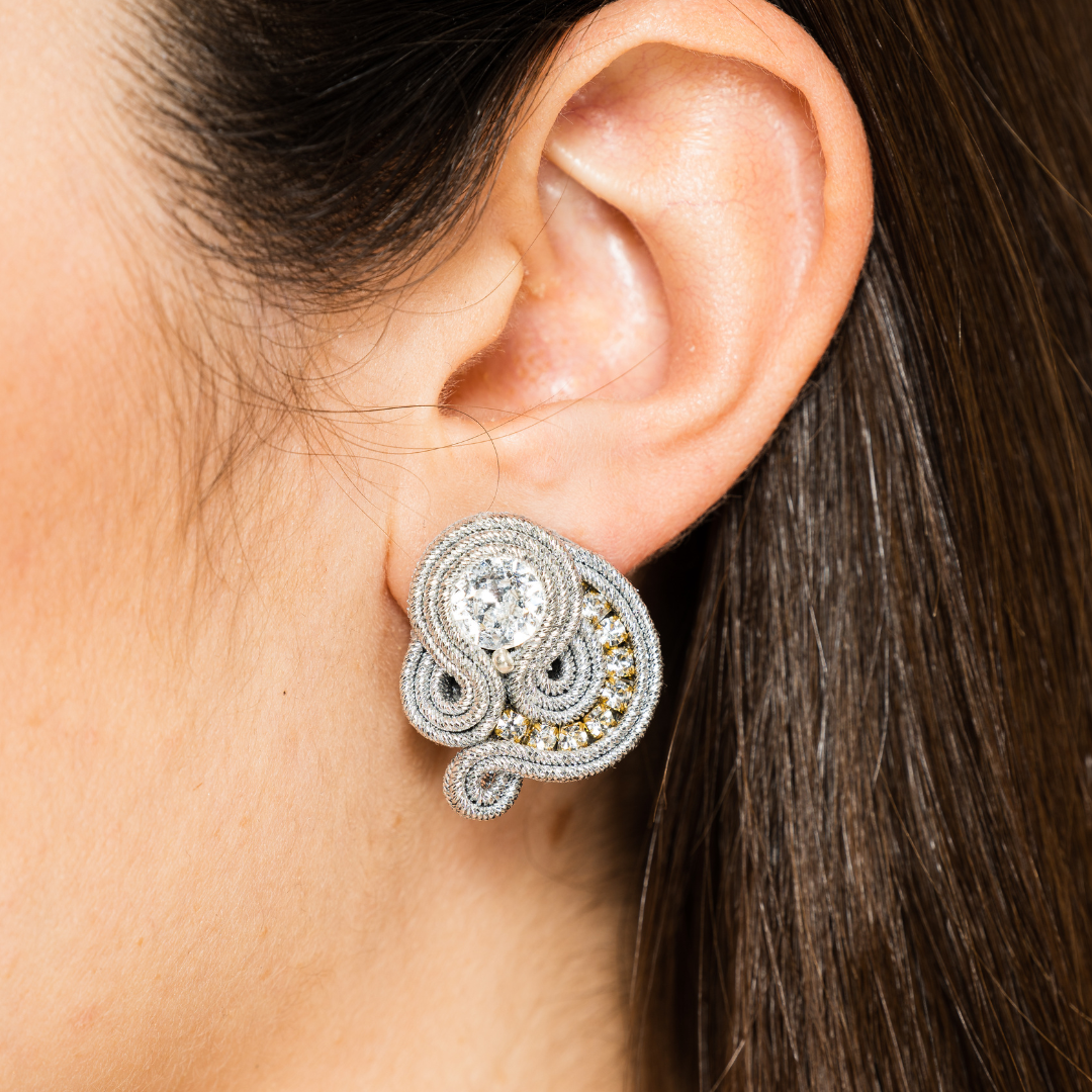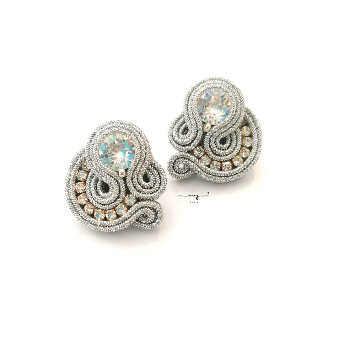 Small size earrings from "Alchimia" Collection by MEG Jewels® Silver edition. Entirely hand-sewn, made of italian yarns, premium crystals, nickel free pins, Alcantara.