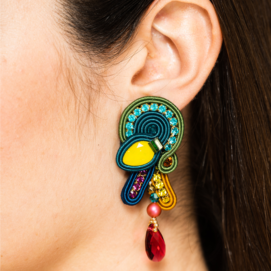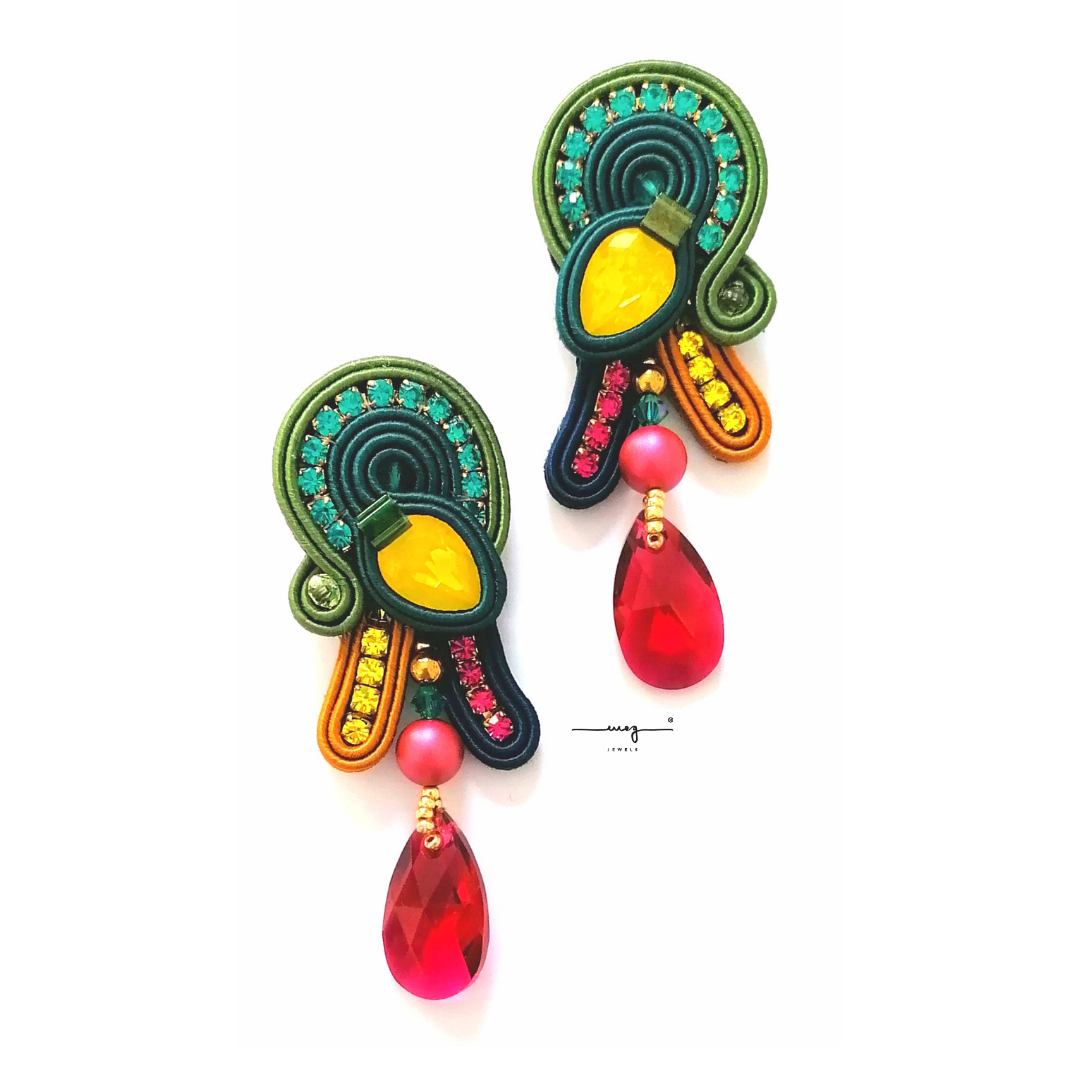 Earrings medium size, "Amazzonia" Collection by MEG Jewels®. Entirely hand-sewn, made of Italian yarns, premium crystals, nickel free pins, Alcantara. Certificate of guarantee and authenticity.