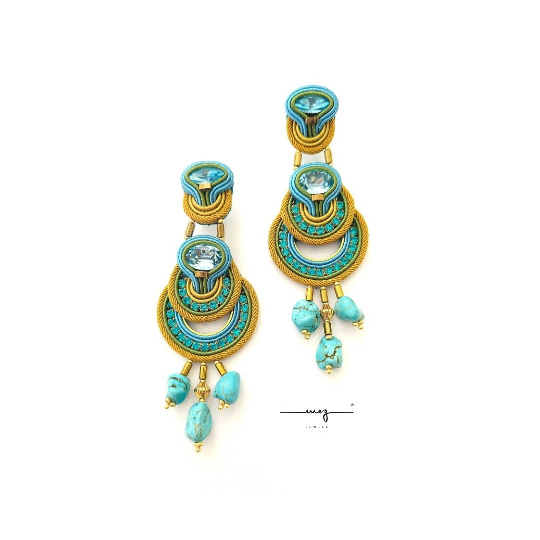 Interamente cuciti a mano, realizzati con intrecci di filati italiani, cristalli premium, perni nickel free, finiture in Alcantara. Colori: turchese, verde salvia, acquamarina, oro, ocra. Certificato di garanzia e autenticità. Lunghezza cm 10.5.