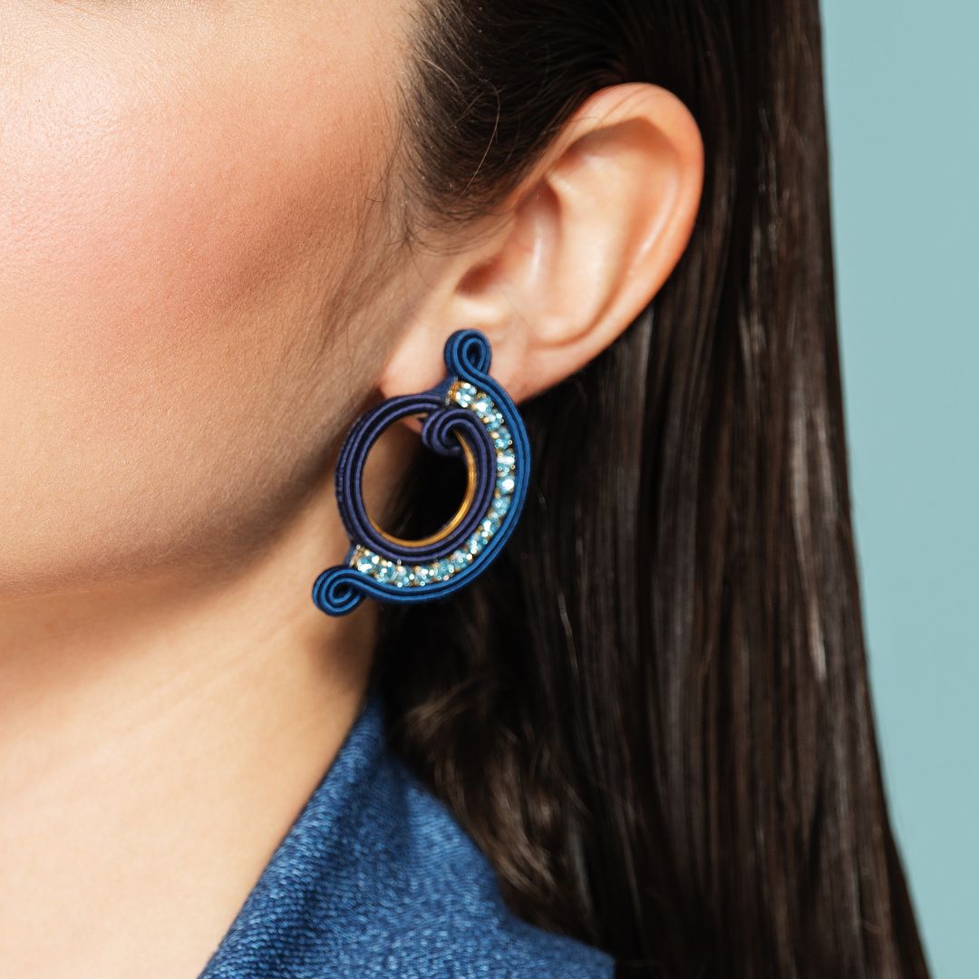 Medium size earrings from Galaxy Collection by MEG Jewels®. Entirely hand-sewn, made of italian yarns, premium crystals, nickel free pins, Alcantara. Certificate of guarantee and authenticity.