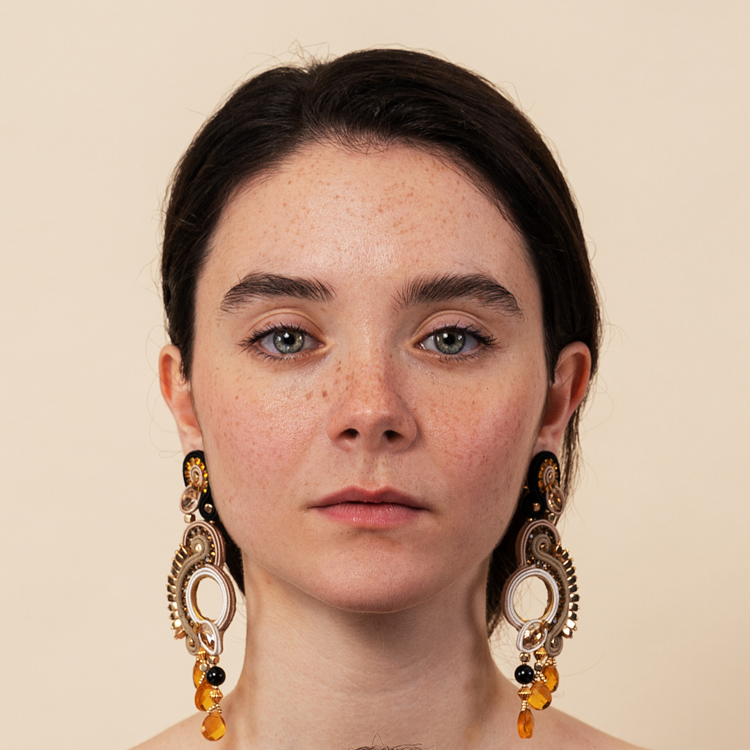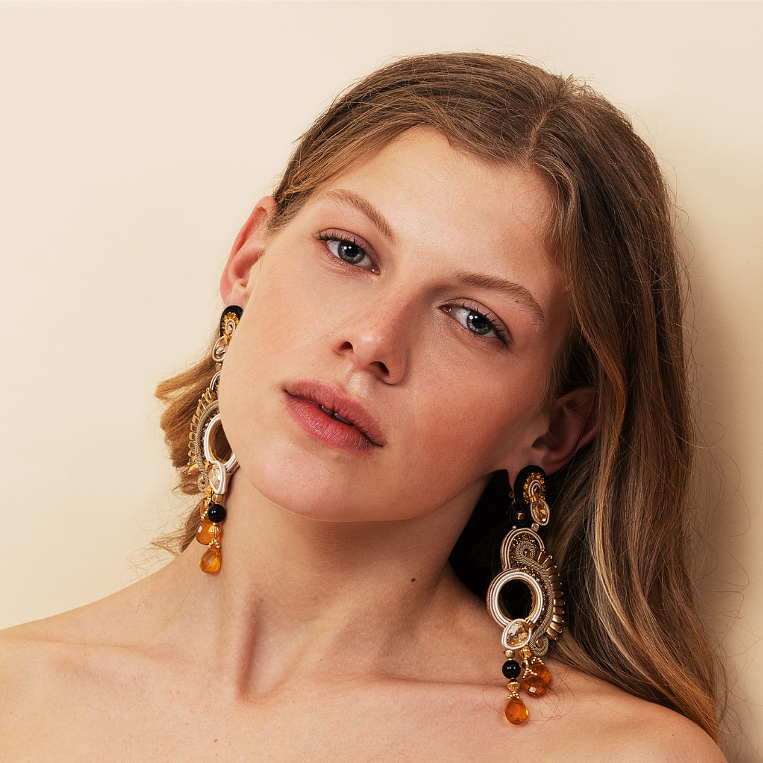 Orecchini misura lunga, Collezione GENESIS by MEG Jewels®. Colori: avorio, sabbia, oro, nero.