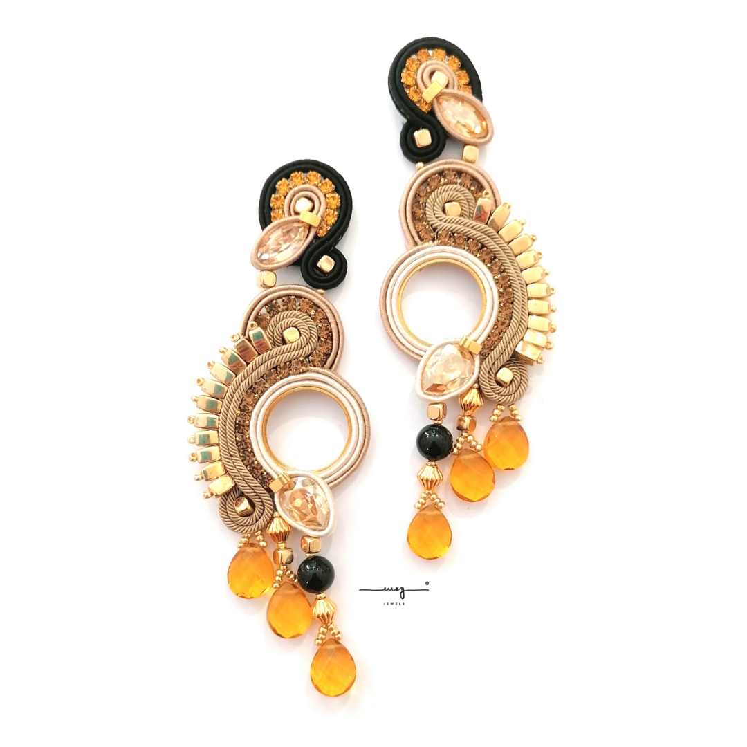 Long size earrings, GENESIS Collection by MEG Jewels®. Entirely hand-sewn, made of Italian yarns, premium crystals, citrine quartz, nickel free pins, Alcantara. Certificate of guarantee and authenticity.
