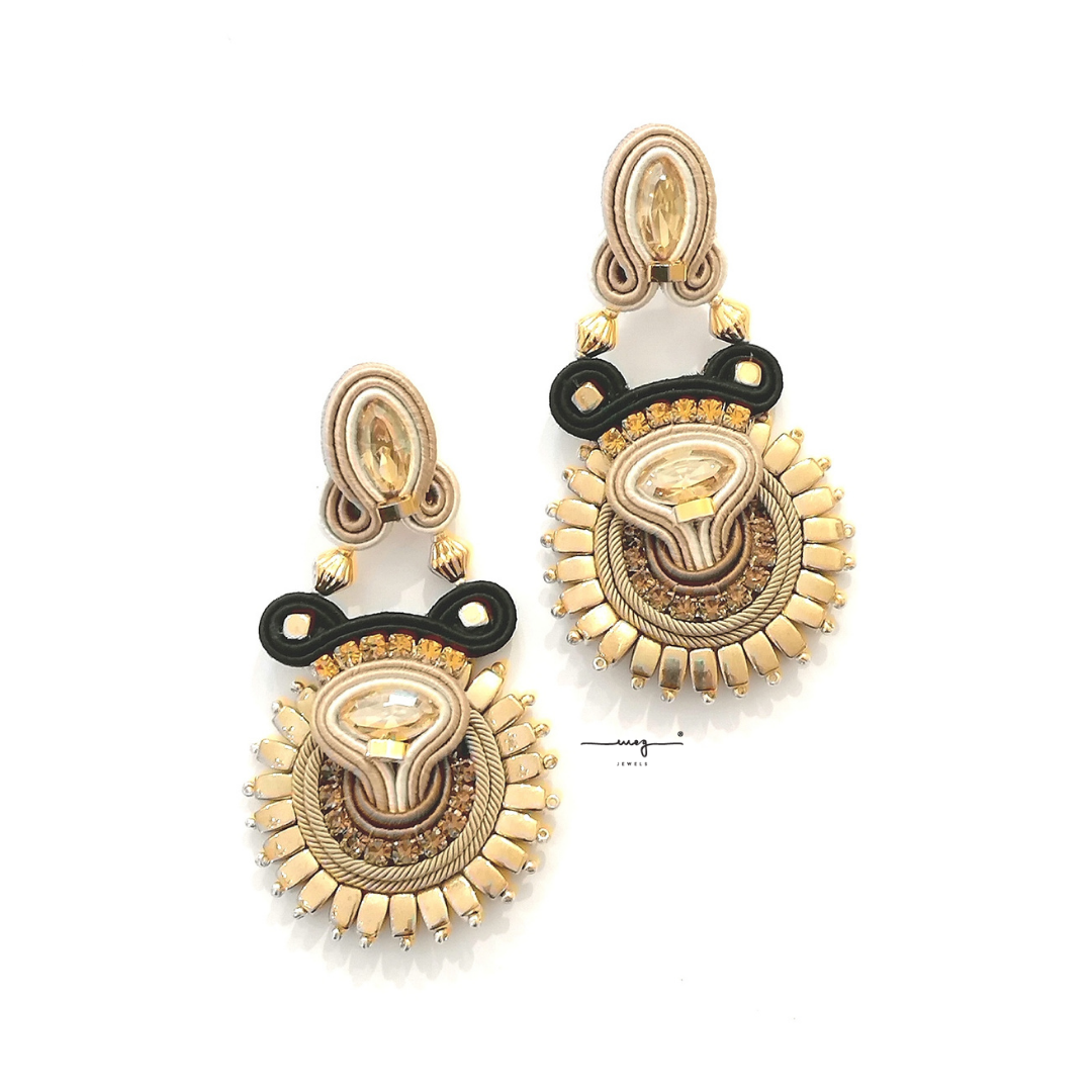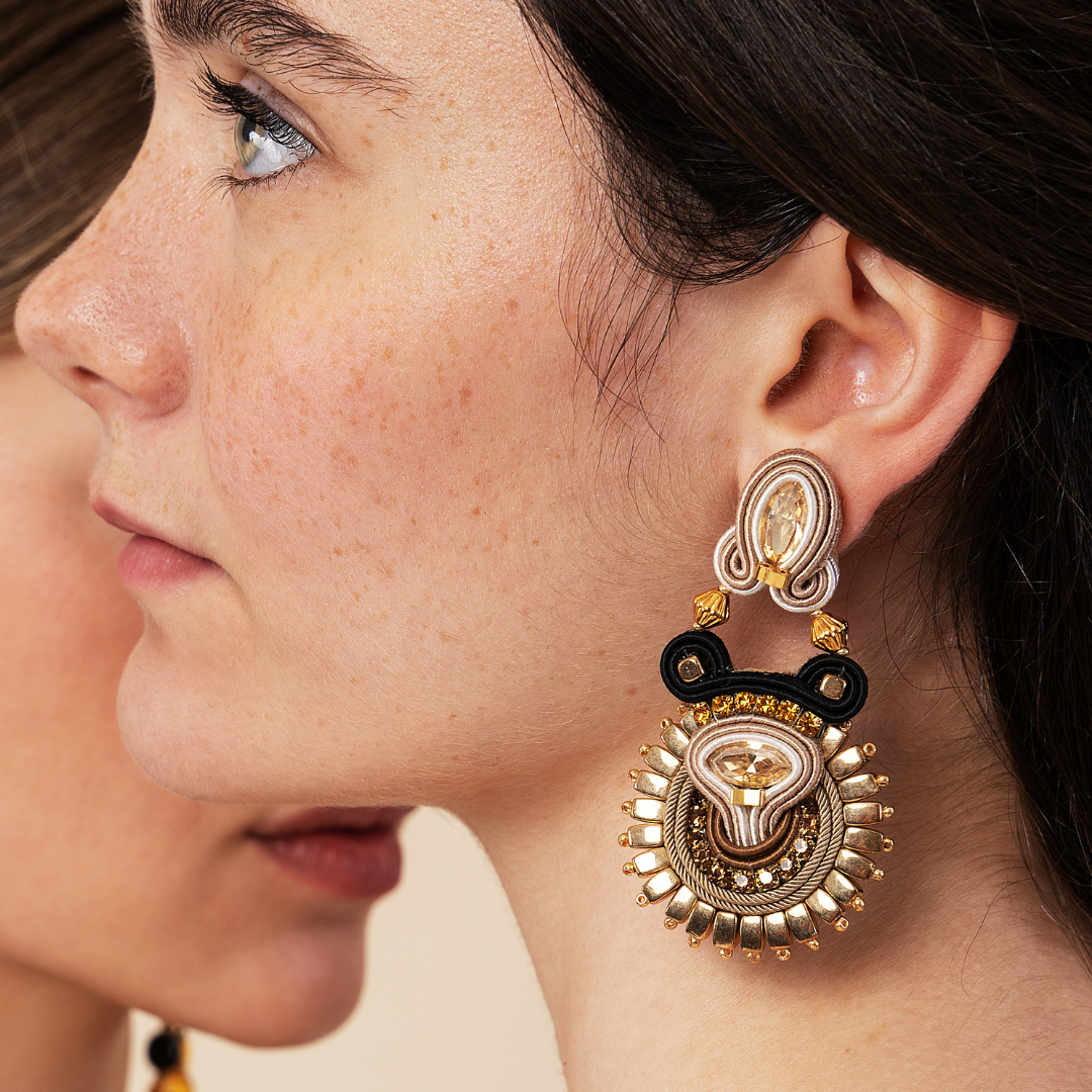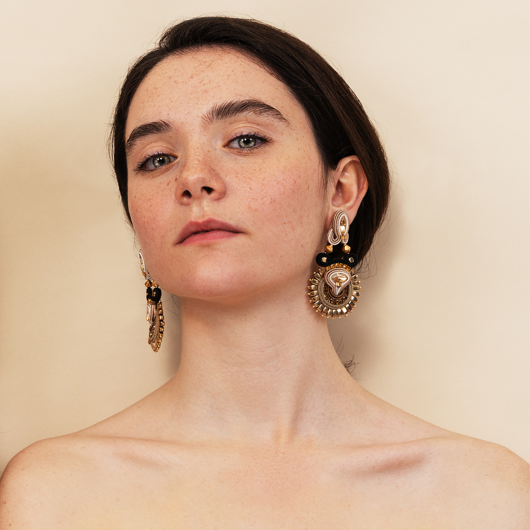 Orecchini misura lunga, Collezione GENESIS by MEG Jewels®. Colori: avorio, sabbia, oro, nero.