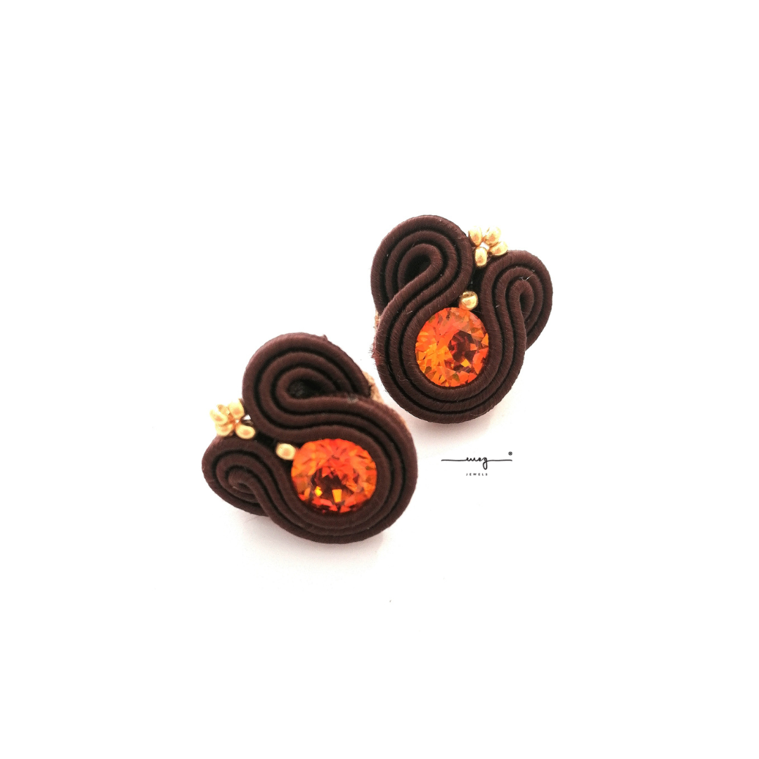 Entirely hand-sewn, the 'BabyM™ originals' are extrasmall earrings by MEG Jewels® made of italian yarns, premium crystals, nickel free pins, Alcantara. Certificate of guarantee and authenticity. Brown and orange color.