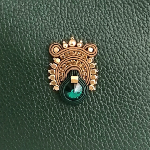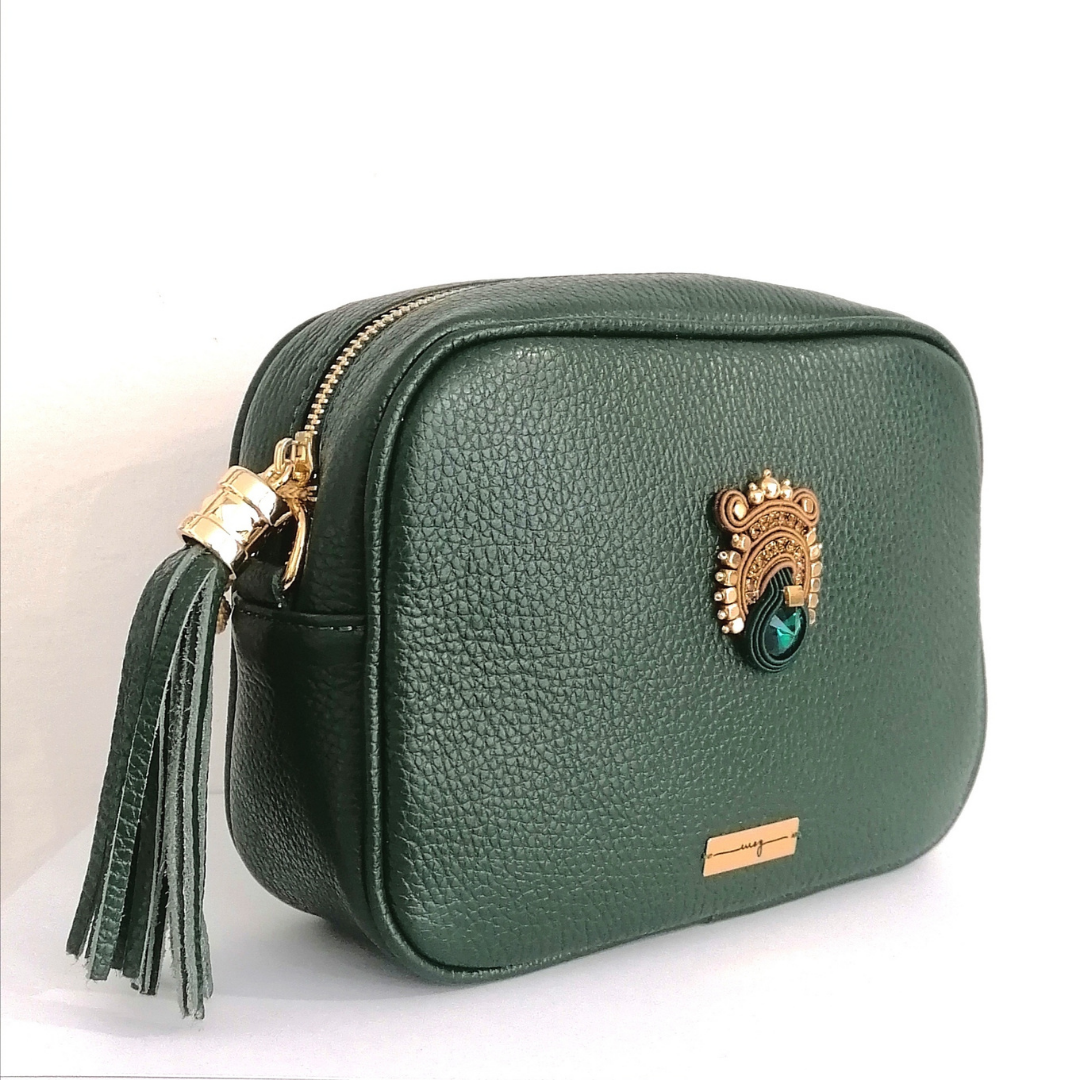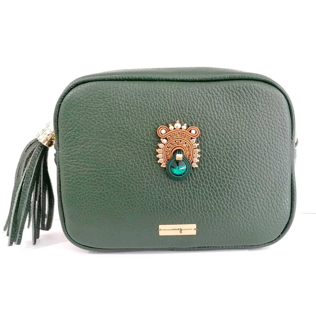 Borsa in vera pelle Made in Italy, con gioiello interamente cucito a mano: realizzato con intrecci di filati italiani, cristalli premium, finiture in Alcantara. Chiusura con zip, tracolla in pelle, regolabile ed estraibile, nappina in pelle. Dimensioni: base 20 cm, altezza 15 cm, larghezza 7 cm. Colore borsa: verde bosco. Colore gioiello: verde bosco, cammello, dettagli oro. Certificato di garanzia e autenticità.