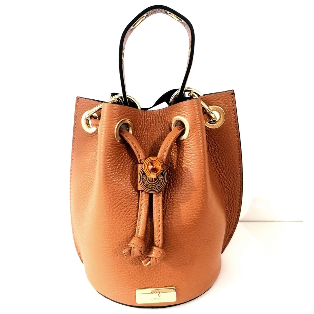 Borsa in vera pelle Made in Italy, con gioiello interamente cucito a mano: realizzato con intrecci di filati italiani, cristalli premium, finiture in Alcantara. Chiusura con laccio, maniglietta e tracolla con catena estraibile. Dimensioni: base 15cm, altezza 20cm. Colore borsa: cognac. Colore gioiello: terracotta, oro. Certificato di garanzia e autenticità.