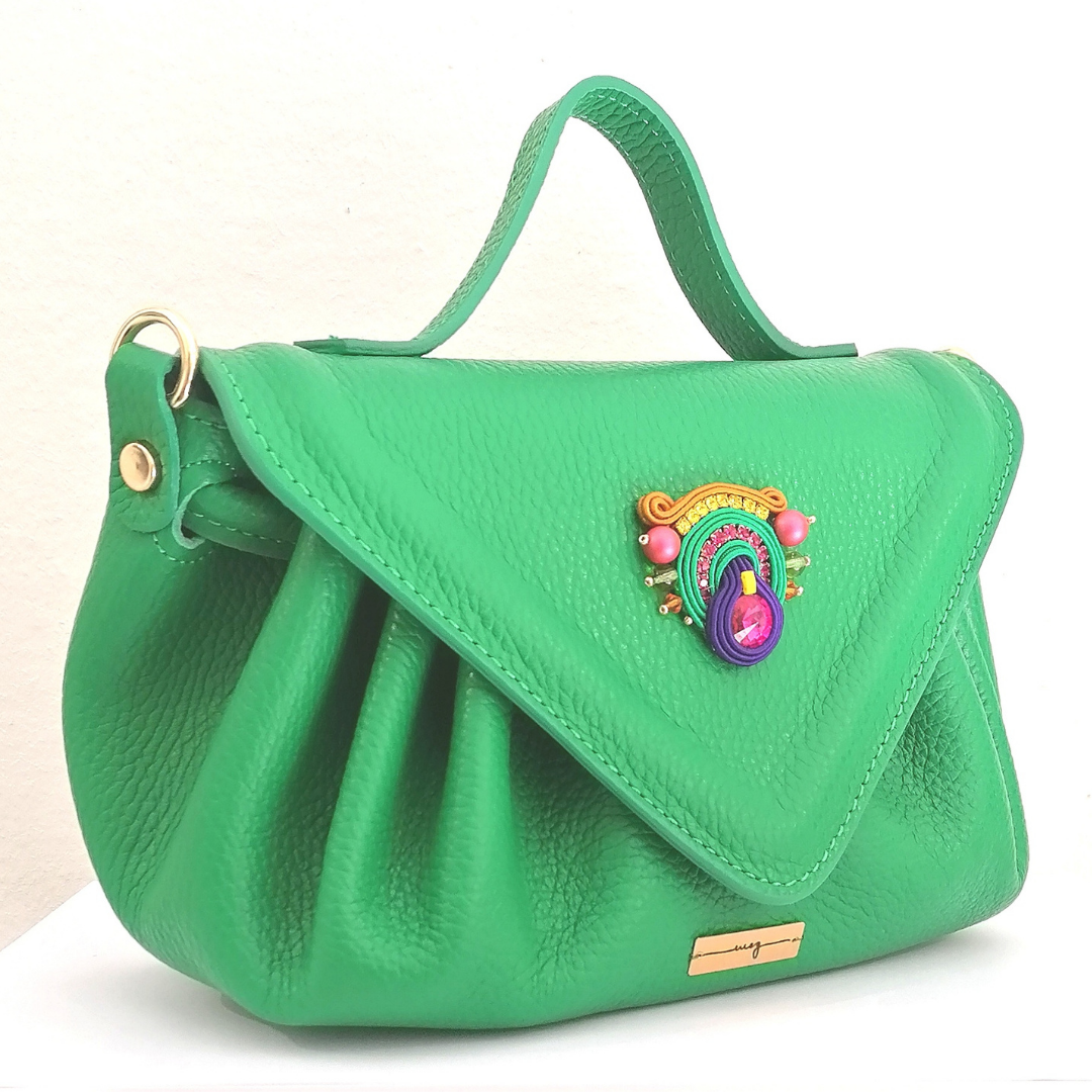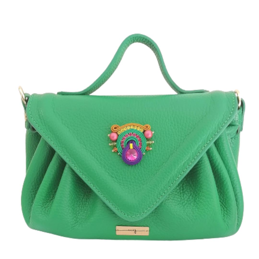 Jewel Bag by MEG Jewels®. Fusion Collection. Genuine leather bag, Made in Italy, with entirely handsewn jewel: made of italian yarns, premium crystals, original Alcantara. Closing with magnet; pocket and shoulder strap. Green color. Certificate of guarantee and authenticity. 23cm x 15cm h x 12cm.