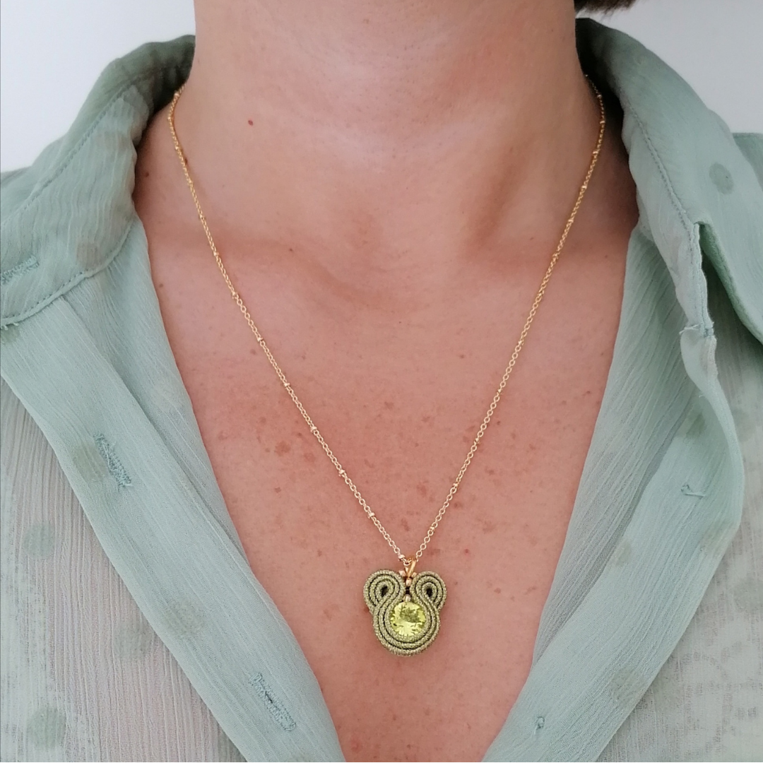 Ciondolo interamente cucito a mano, realizzato con intrecci di filati italiani, cristalli premium, finiture in Alcantara. Catena nickel free con chiusura moschettone e lunghezza regolabile. Certificato di garanzia e autenticità.