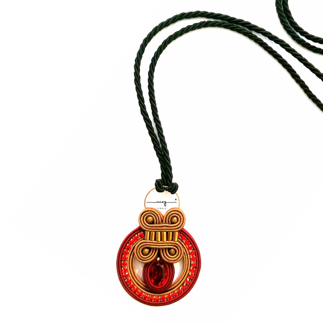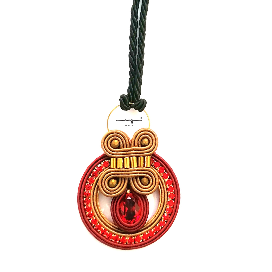 Pendant necklace from Oriente Collection by MEG Jewels®. Entirely hand-sewn, made of italian yarns, premium crystals, Alcantara. Certificate of guarantee and authenticity. Brown an red color, gold details.