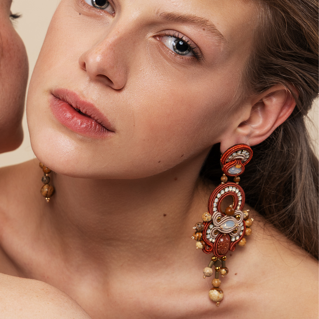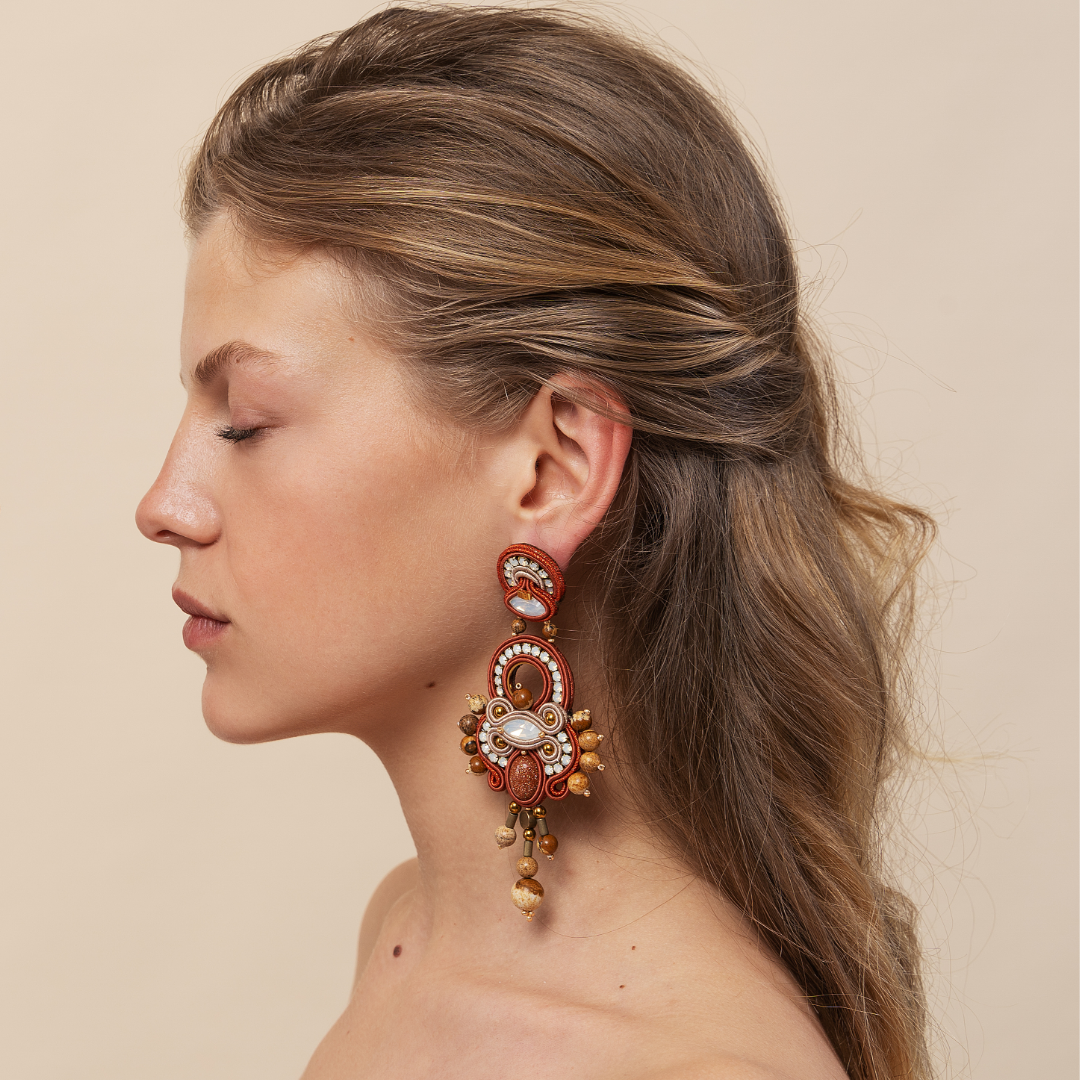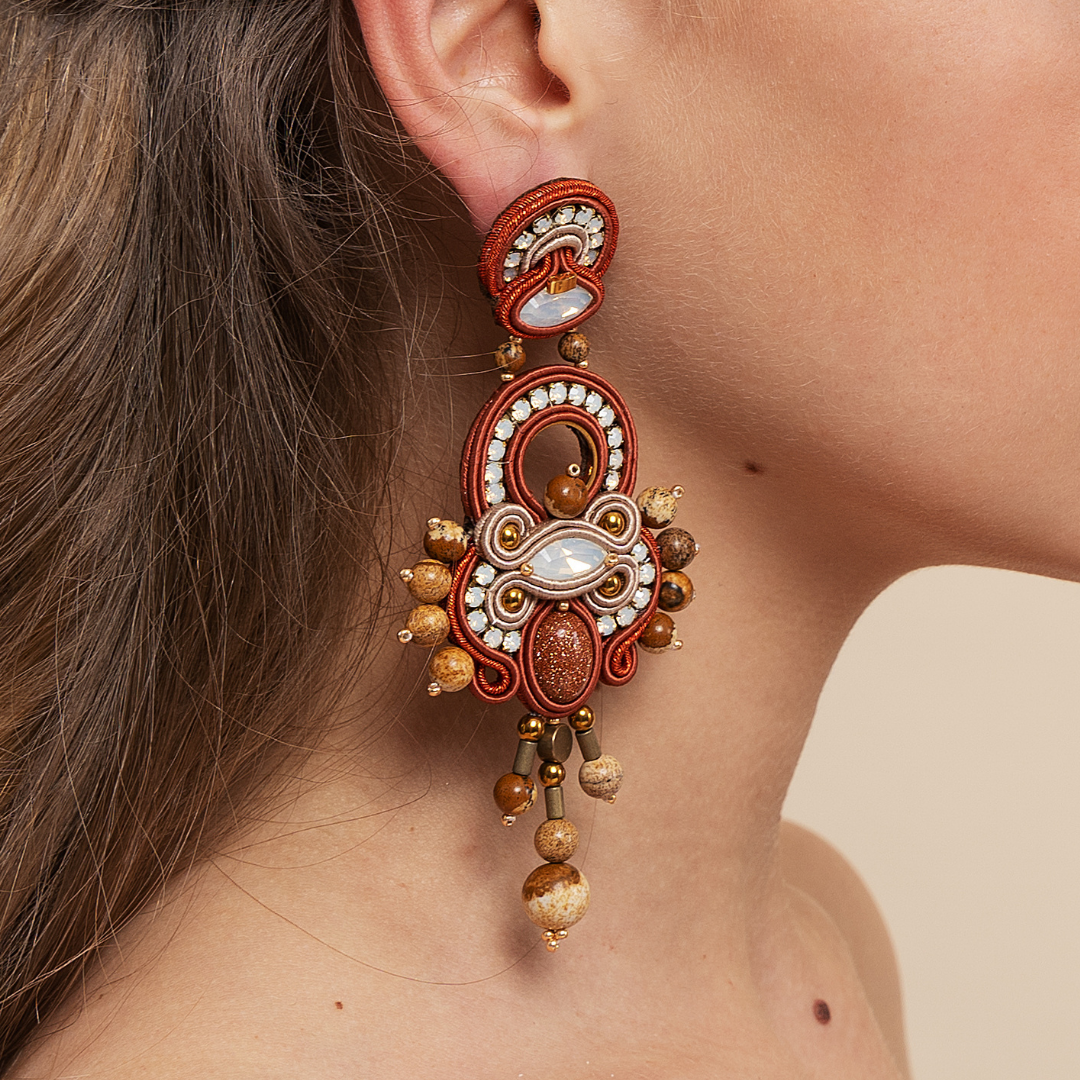 Entirely hand-sewn, the long size earrings from MASAI Collection by MEG Jewels® are made of Italian yarns, premium crystals, ematite, diaspro and gold plated 24k details, nickel free pins, Alcantara.