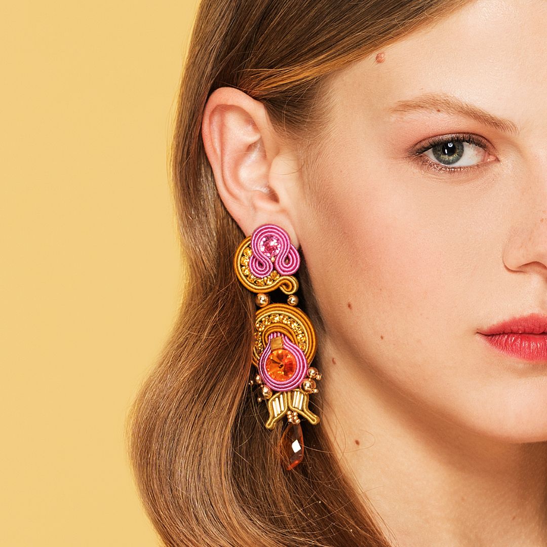 Interamente cuciti a mano, realizzati con intrecci di filati italiani, cristalli premium, perni nickel free, finiture in Alcantara. Lunghezza cm 8,5 circa. Colori: fucsia, terracotta, arancio. Certificato di garanzia e autenticità.