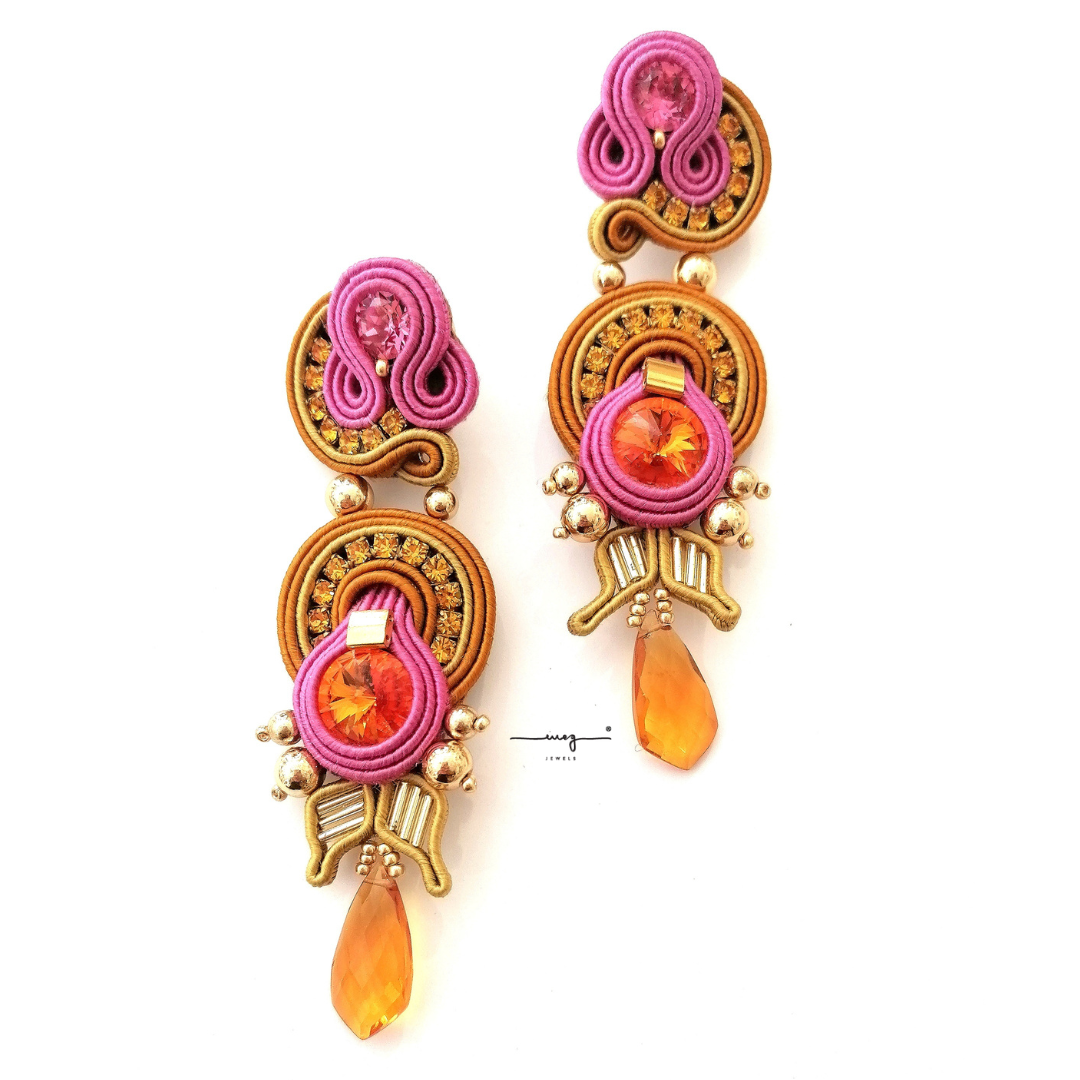 Earrings long size from SUNSET Collection by MEG Jewels®. Entirely hand-sewn, made of Italian yarns, premium crystals, nickel free pins, Alcantara. Pink and orange color. Certificate of guarantee and authenticity.