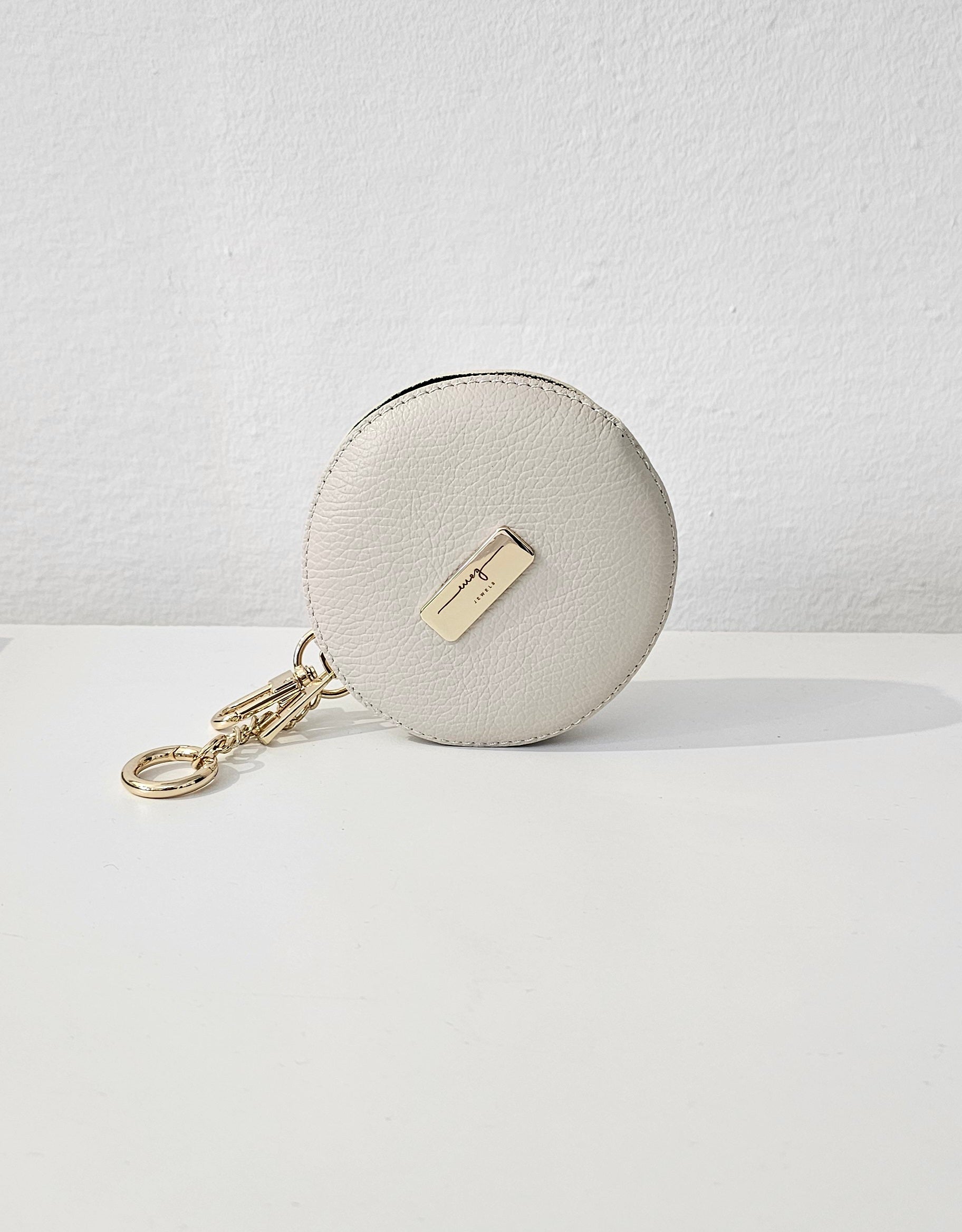 Portatutto tondo in vera pelle Made in Italy. Collezione 'Essentials' by MEG Jewels®. Chiusura con zip, piccola catena con doppio moschettone per attaccarlo alla borsa. Diametro 12 cm. Colore ecru, finiture oro.